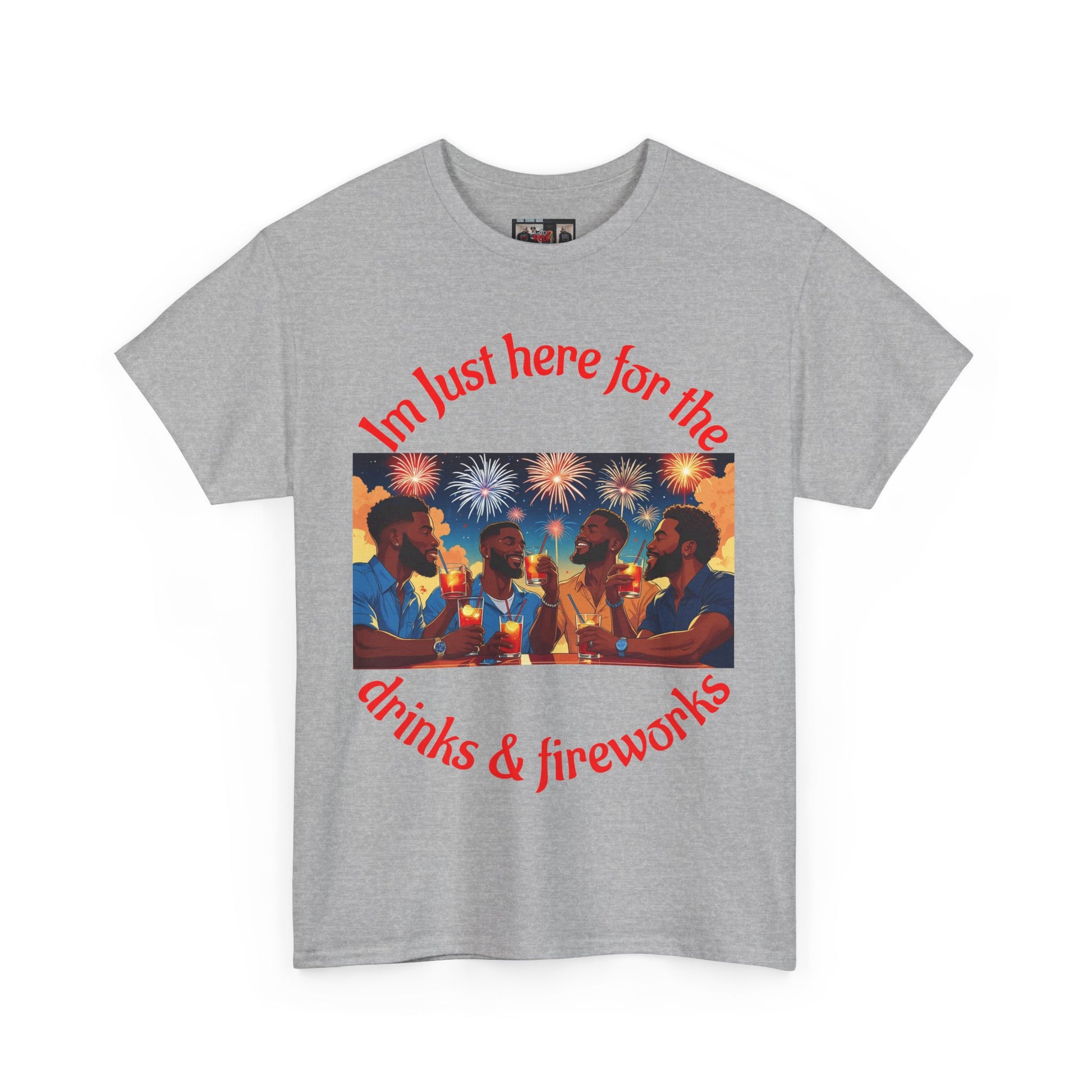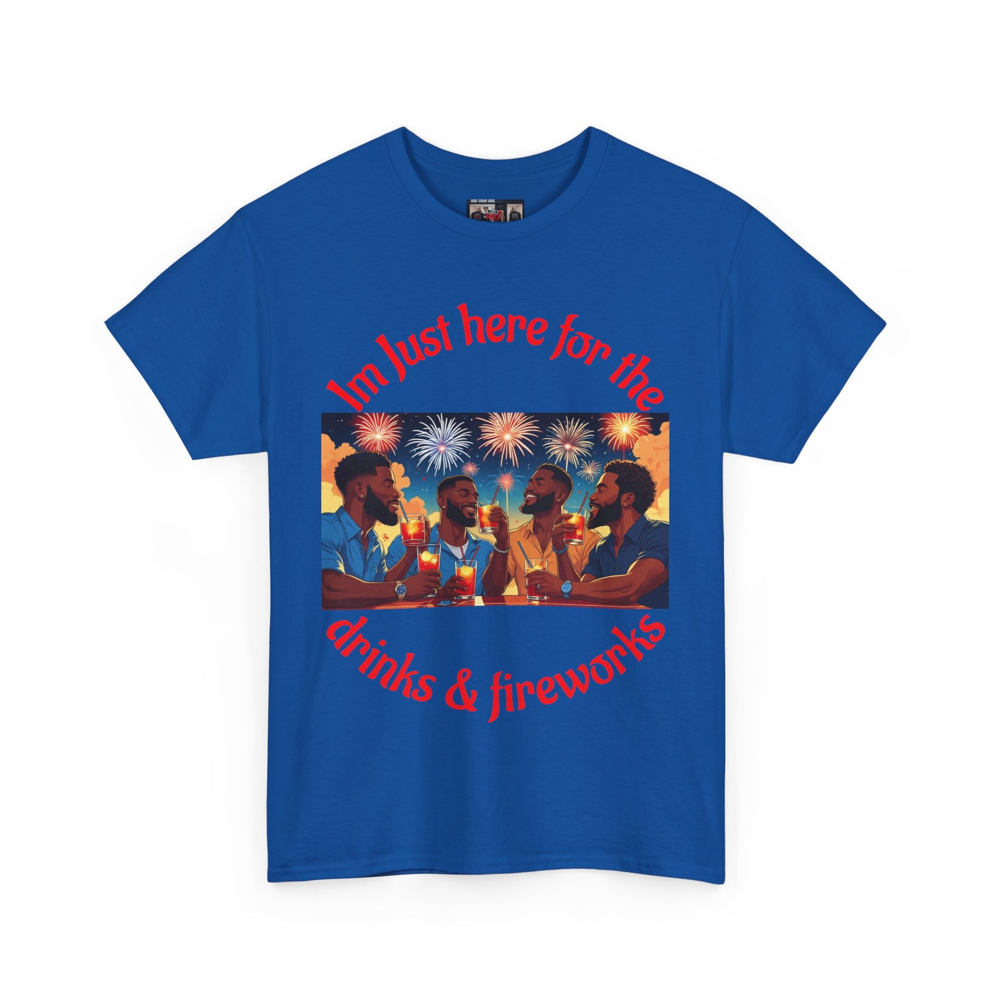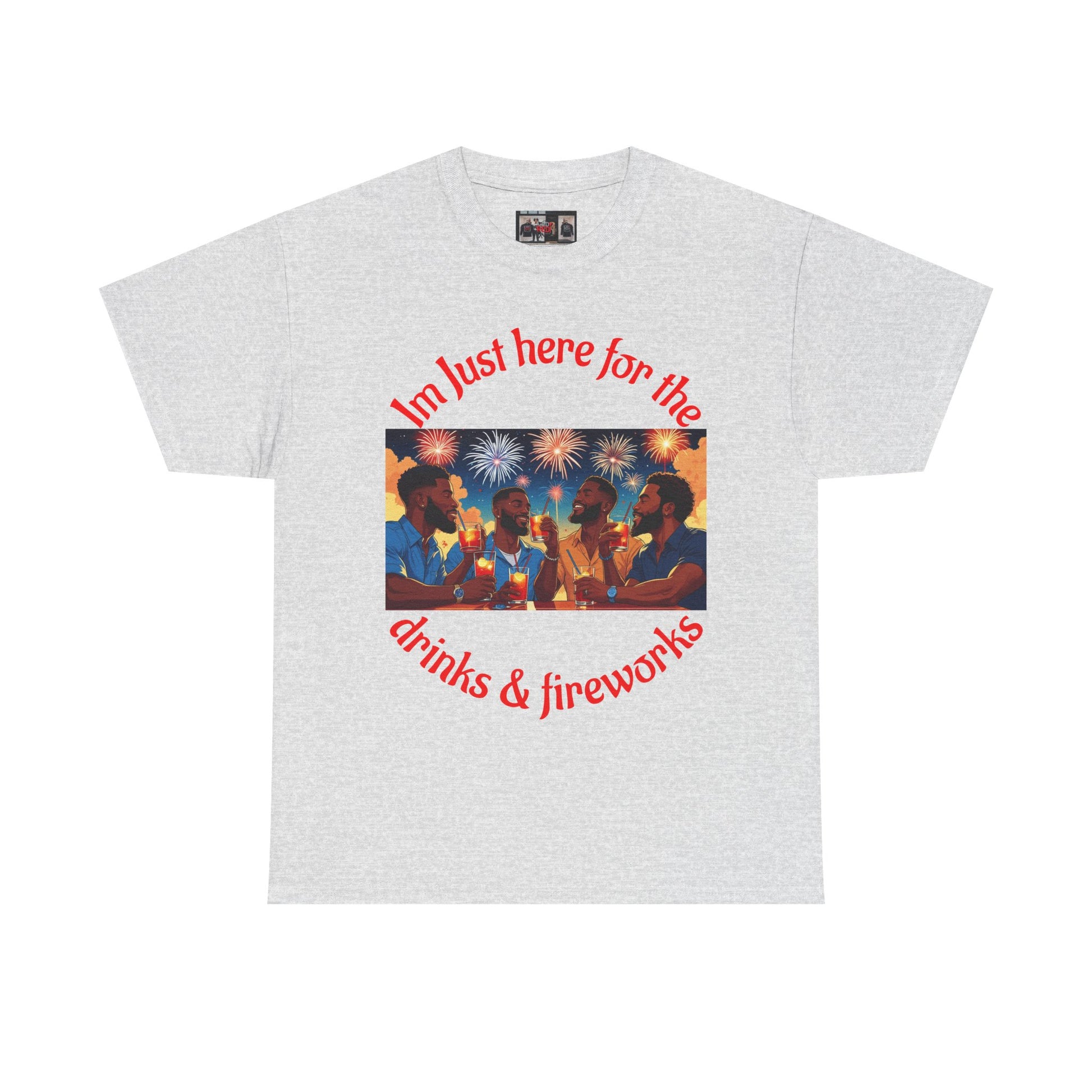 Celebrate 4th of July with this drinks and fireworks tee designed for the men. The tee is made from specially spun fibers for a strong and smooth fabric, perfect for printing. It is unisex and suitable for adults, providing a comfy fit with a crew neckline and tear-away label for a scratch-free experience.
