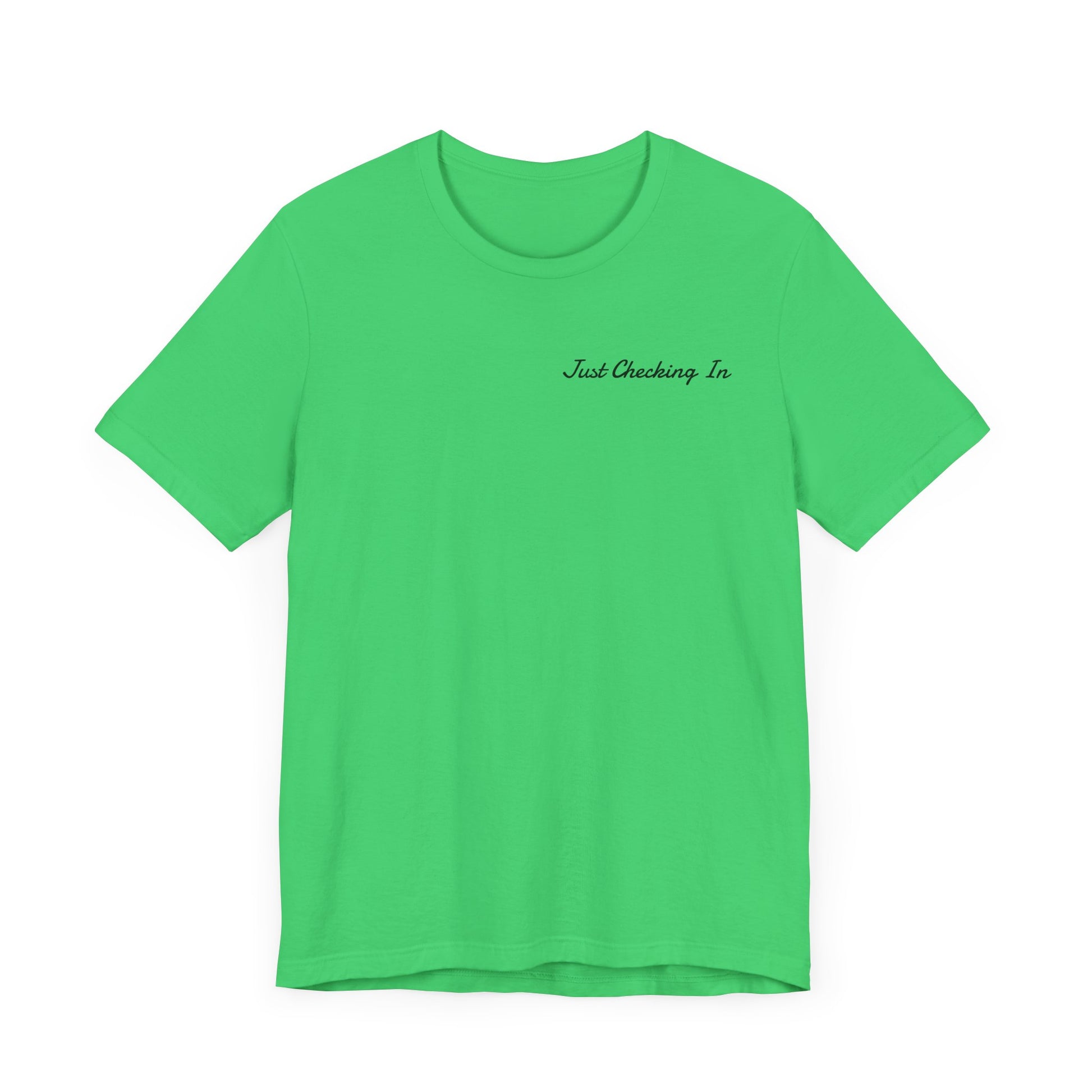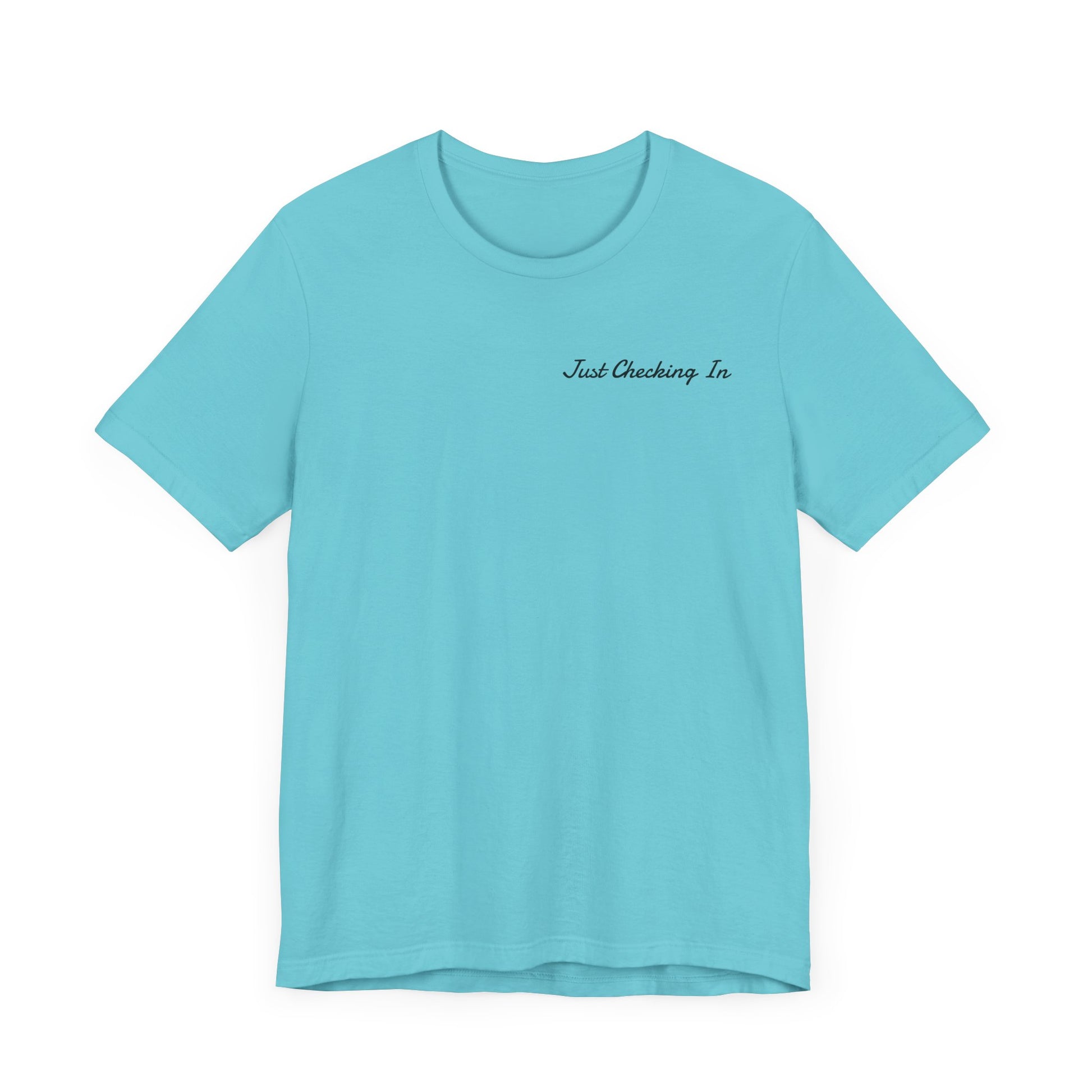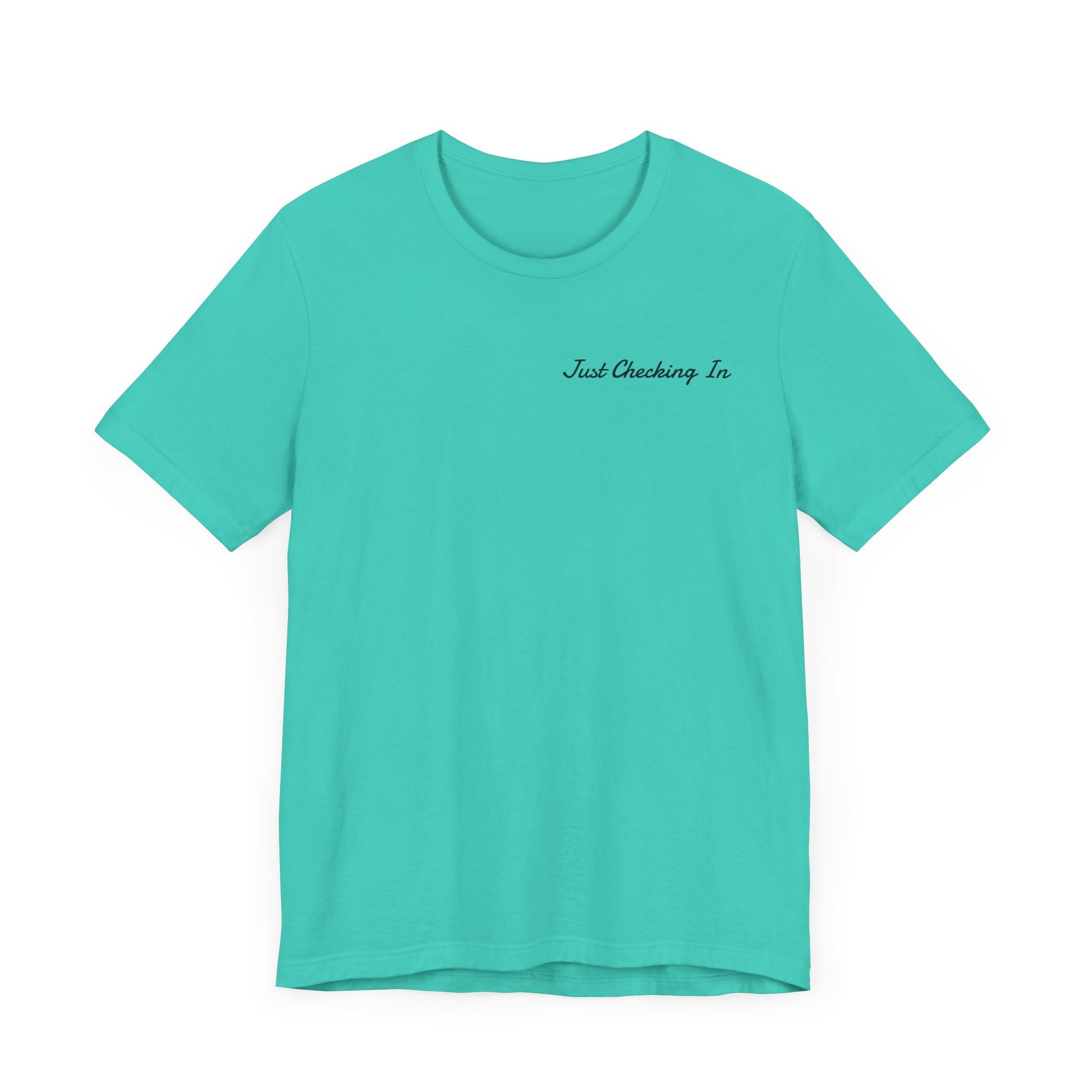 A comfortable and stylish tee with a 'Checking in tee are you okay' design. Perfect for casual wear and lounging around. Ideal for adults looking for a relaxed and trendy piece of clothing. Relevant for mental health awareness days, casual Fridays, and everyday wear.