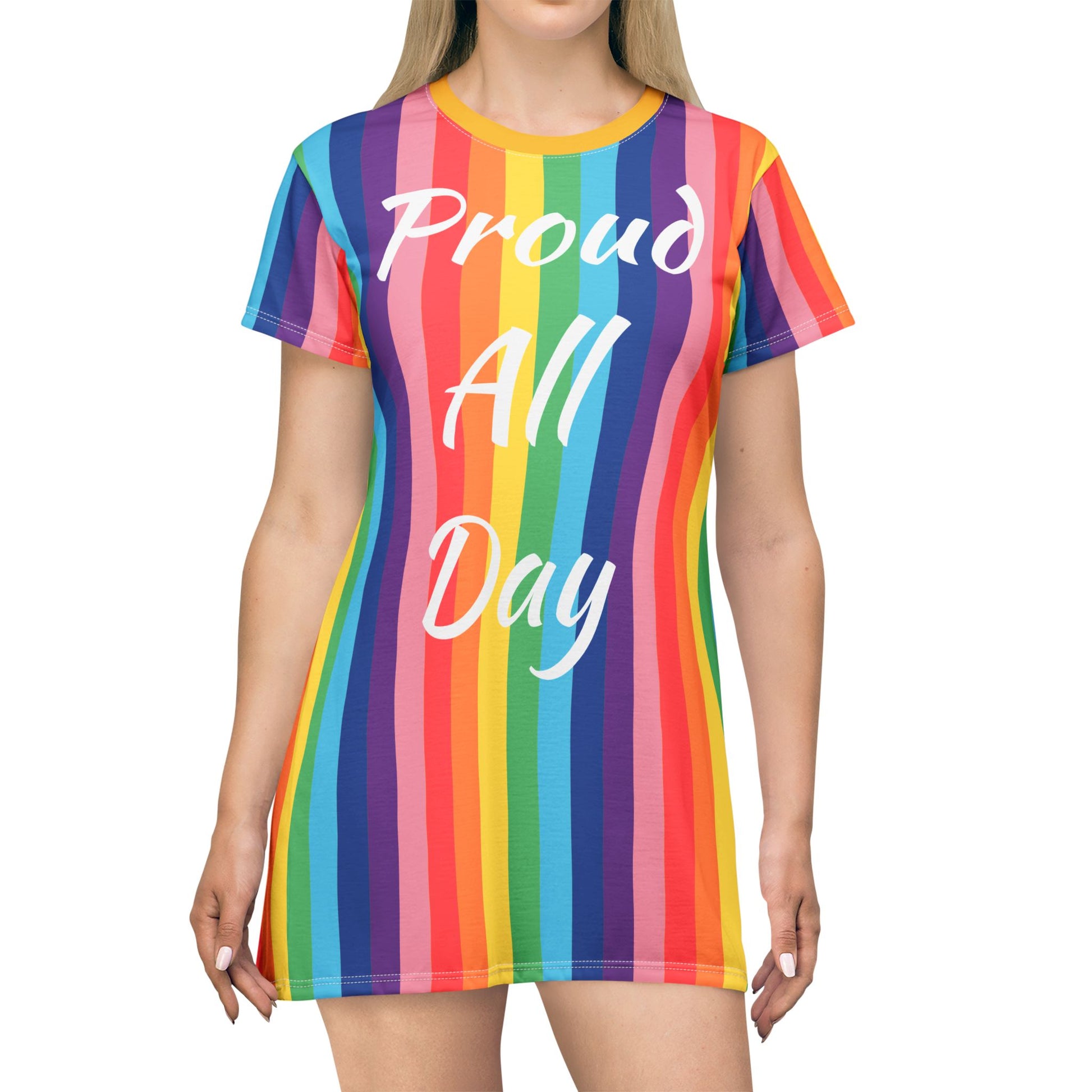 This Proud All Day T-Shirt Dress exudes confidence and empowerment. Perfect for the fashion-forward individual who wants to make a statement. Ideal for casual outings, parties, and gatherings. Relevant for Pride Month, LGBTQ+ celebrations, and everyday wear.