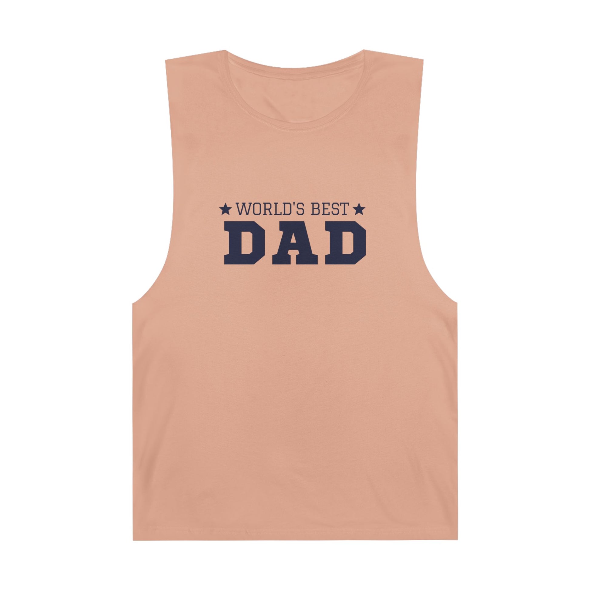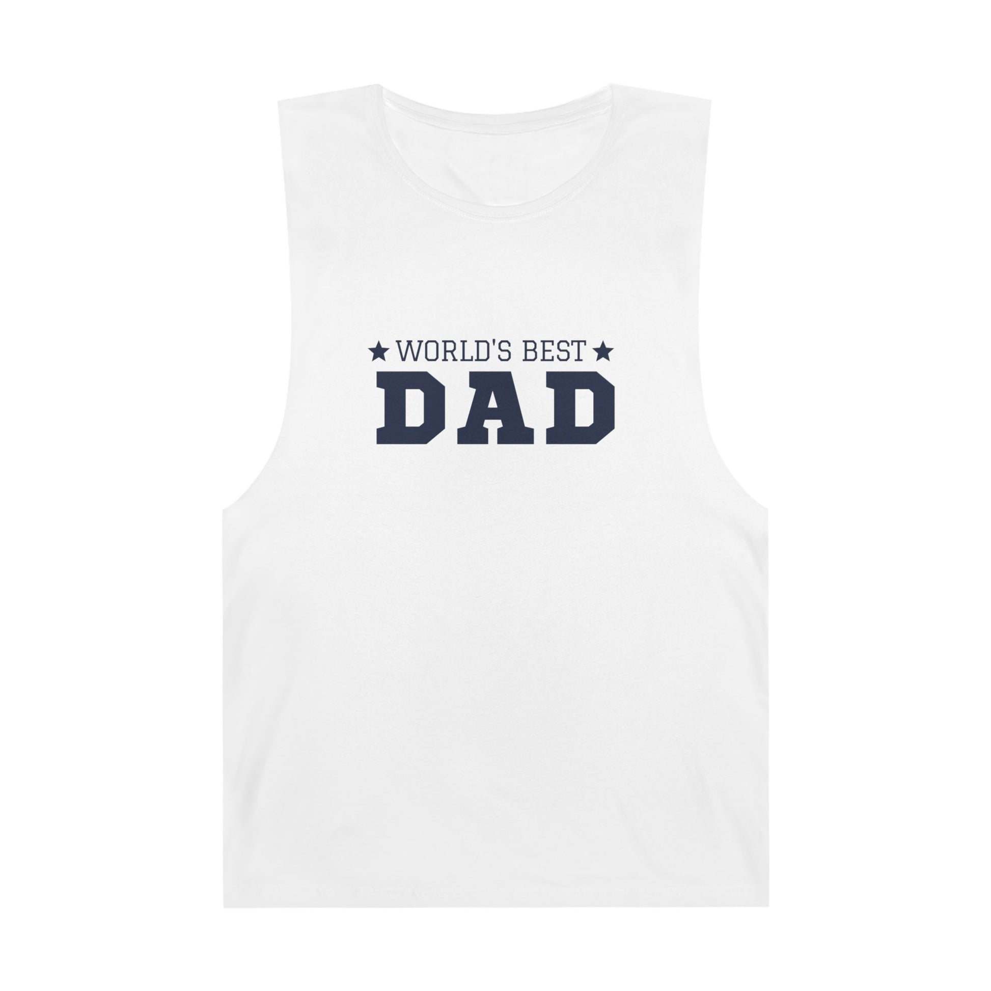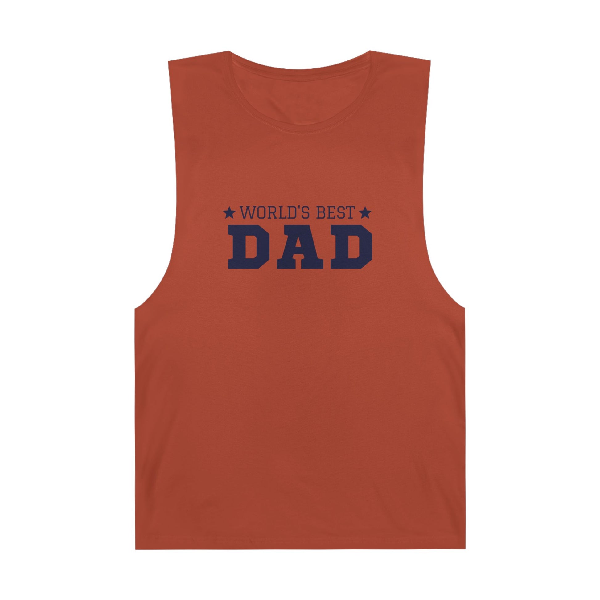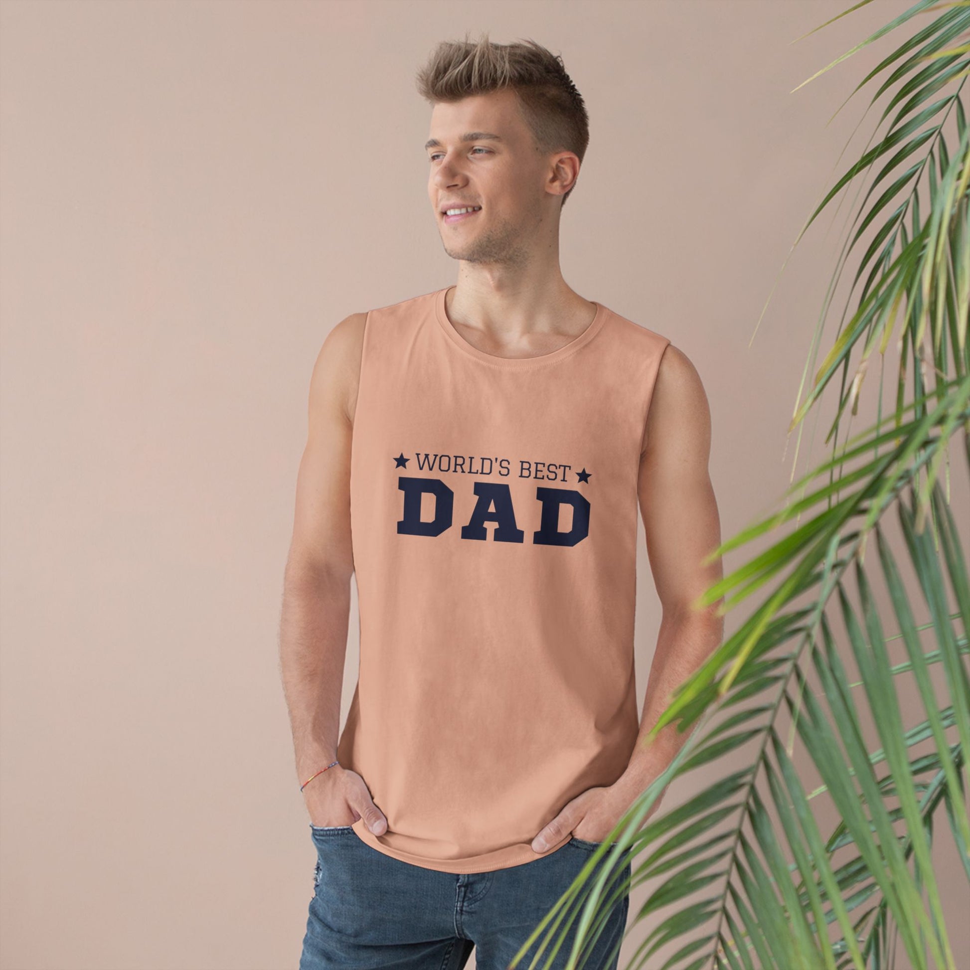 A comfortable and stylish tank top with a design that reads 'World's best dad'. Perfect for dads who want to show off their title with pride. Ideal for Father's Day, birthdays, or just everyday wear. The tank is made of light fabric and features raw sleeve edges, a ribbed knit collar, and a regular fit.